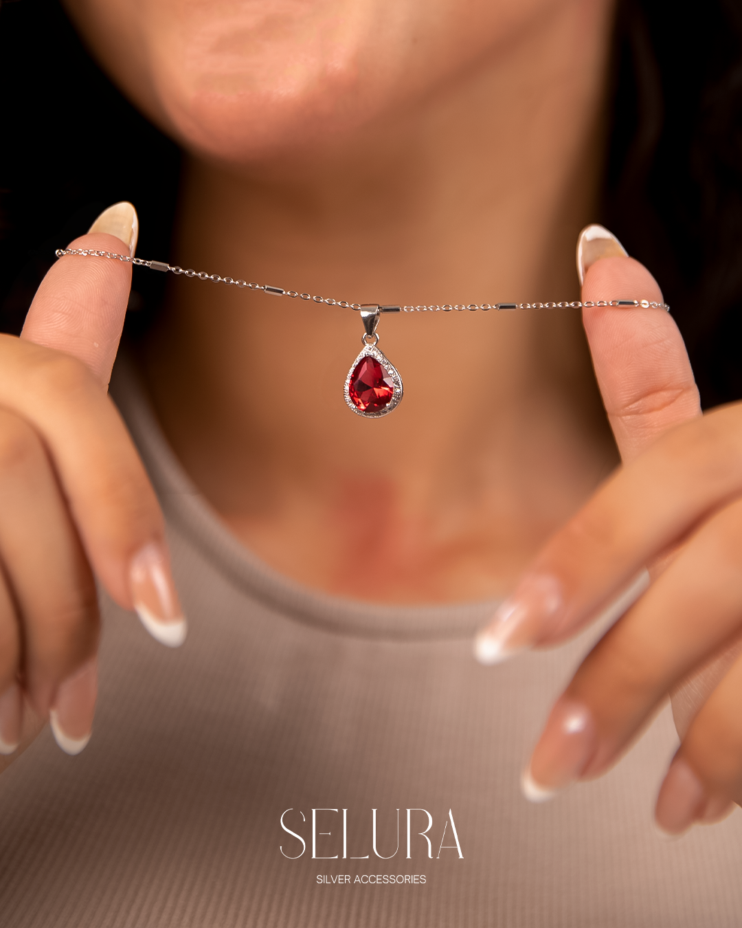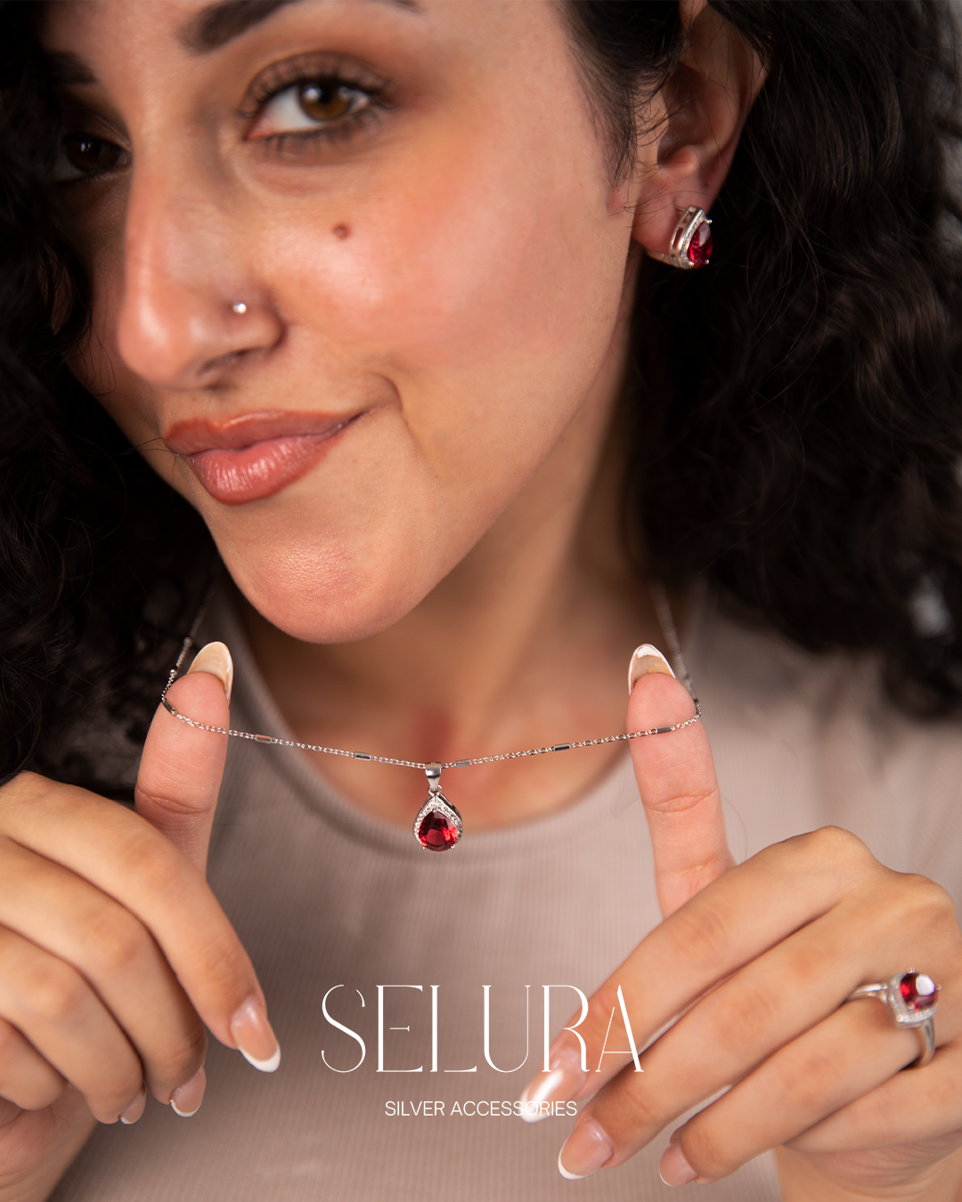 A refined silver set featuring a deep crimson teardrop stone, delicately framed with shimmering pavé details. The necklace rests softly along the neckline, while the matching ring adds a subtle statement to the hand. Designed to reflect warmth, femininity, and timeless elegance, this set is perfect for evening looks, special occasions, or as a romantic everyday piece.
